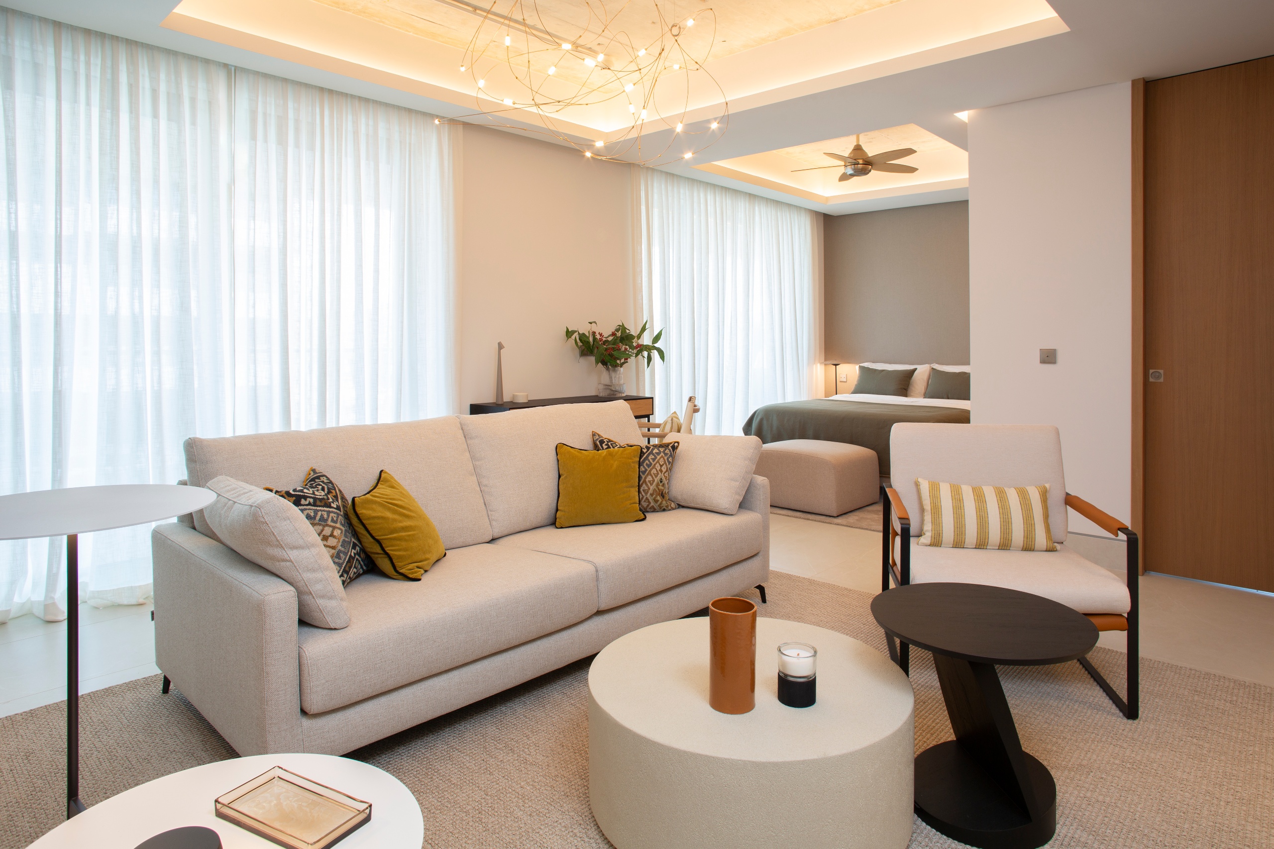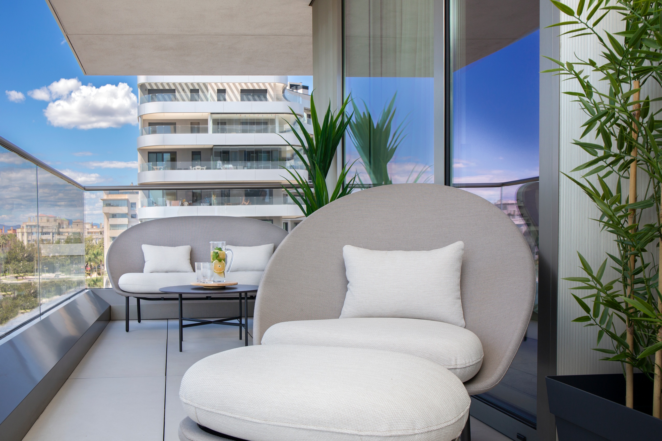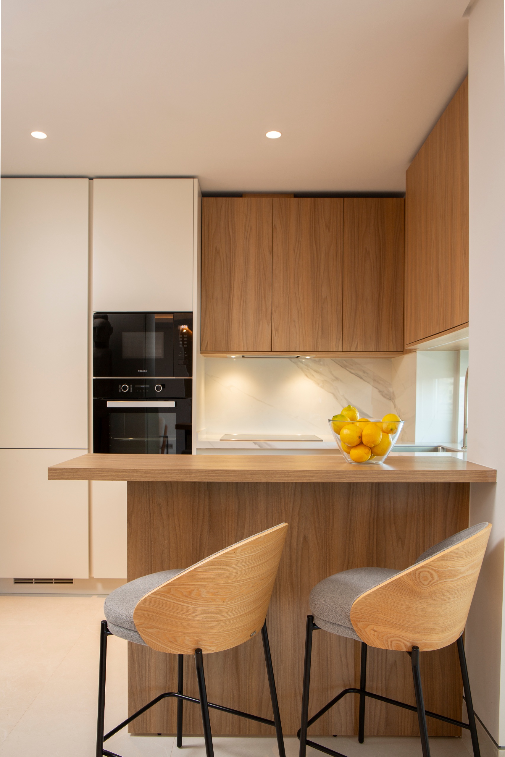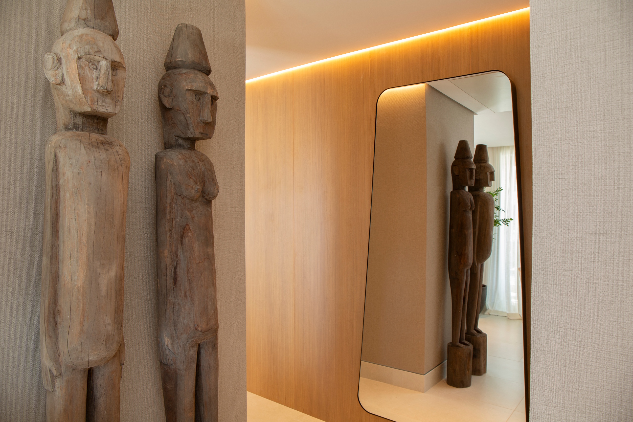 El concepto principal fue establecer una conexión fluida entre el interior y el exterior, mediante piezas de mobiliario de diseño orgánico y líneas suaves, materiales nobles, tejidos naturales y acabados contemporáneos como el microcemento y los revestimientos vinílicos textiles en pared. La iluminación, de carácter vanguardista pero sutil, juega un papel esencial al realzar cada rincón del apartamento, tanto durante el día como en la noche.