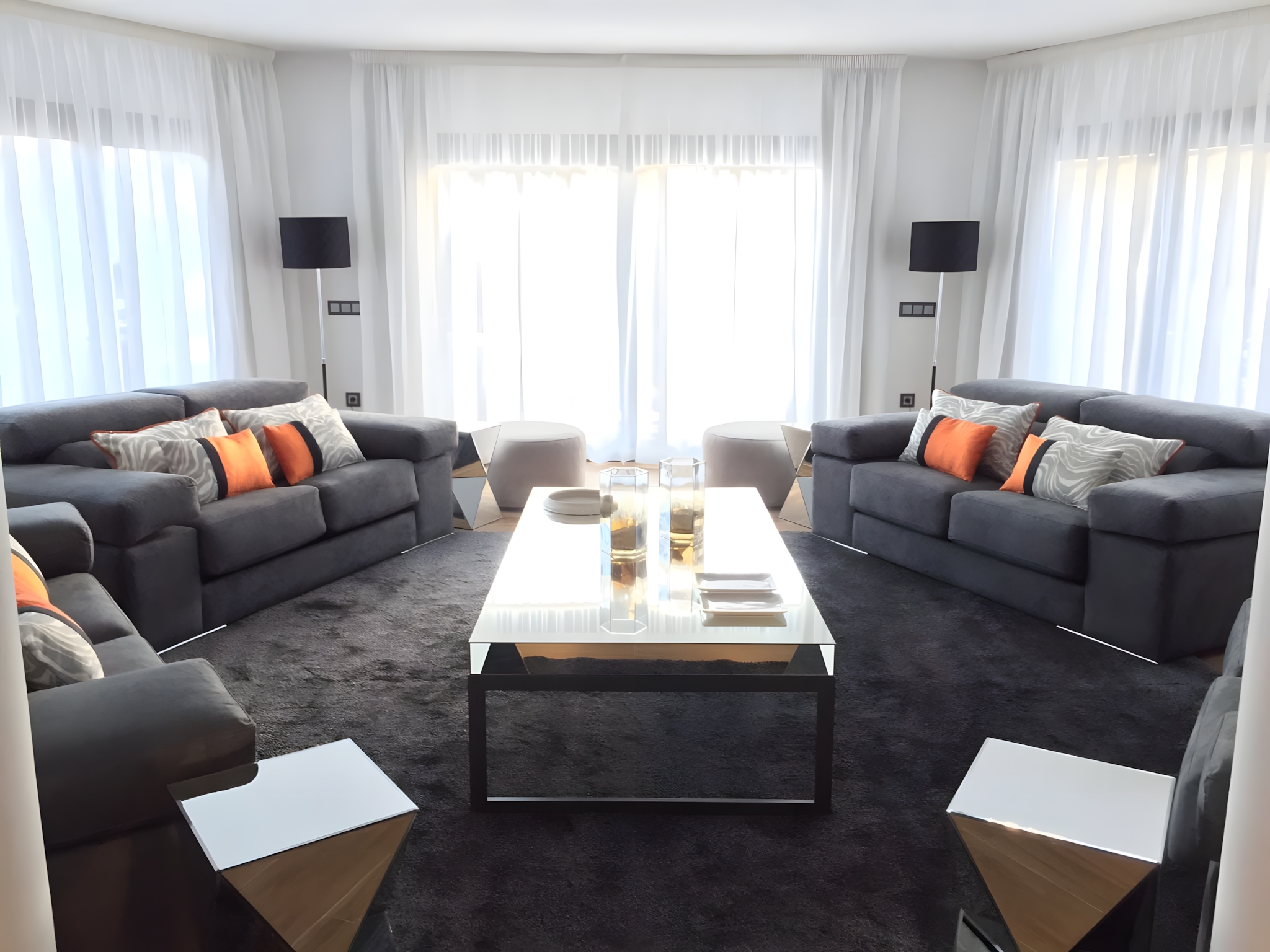 Amplio salón decorado con sofás grises, cojines naranjas y cortinas blancas, creando un espacio luminoso y acogedor perfecto para el descanso y la convivencia.